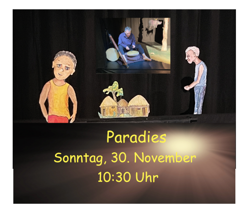 Nächste Familienaufführung "Paradies" am Sonntag 30. November. „Paradies“ ist eine frei erzählte Geschichte, die auf einer wahren Begebenheit basiert. Die Liebe zu den Tieren und zu den Bäumen läßt einen Jungen über sich hinauswachsen. Ein Unwetter brach Äste und Baumstämme, Wassermassen entwurzelte die Bäume und spülten sie fort. Der Sturm raubte den Tieren ihre Lebensgrundlage. Um den Tieren ein neues Zuhause zu schaffen, pflanzt ein Junge - allen Widerständen zum Trotz - Gräser, Sträucher und Bäume. Ein neuer Wald, entsteht - ein Paradies. Geeignet für Kinder ab 5 Jahren. Jüngere Kinder sind mit der Spielform überfordert. Nach oben gib es keine Grenze. Wie gewohnt können Sie Kartenreservierungen unter tickets@hallodu-theater.de vornehmen.