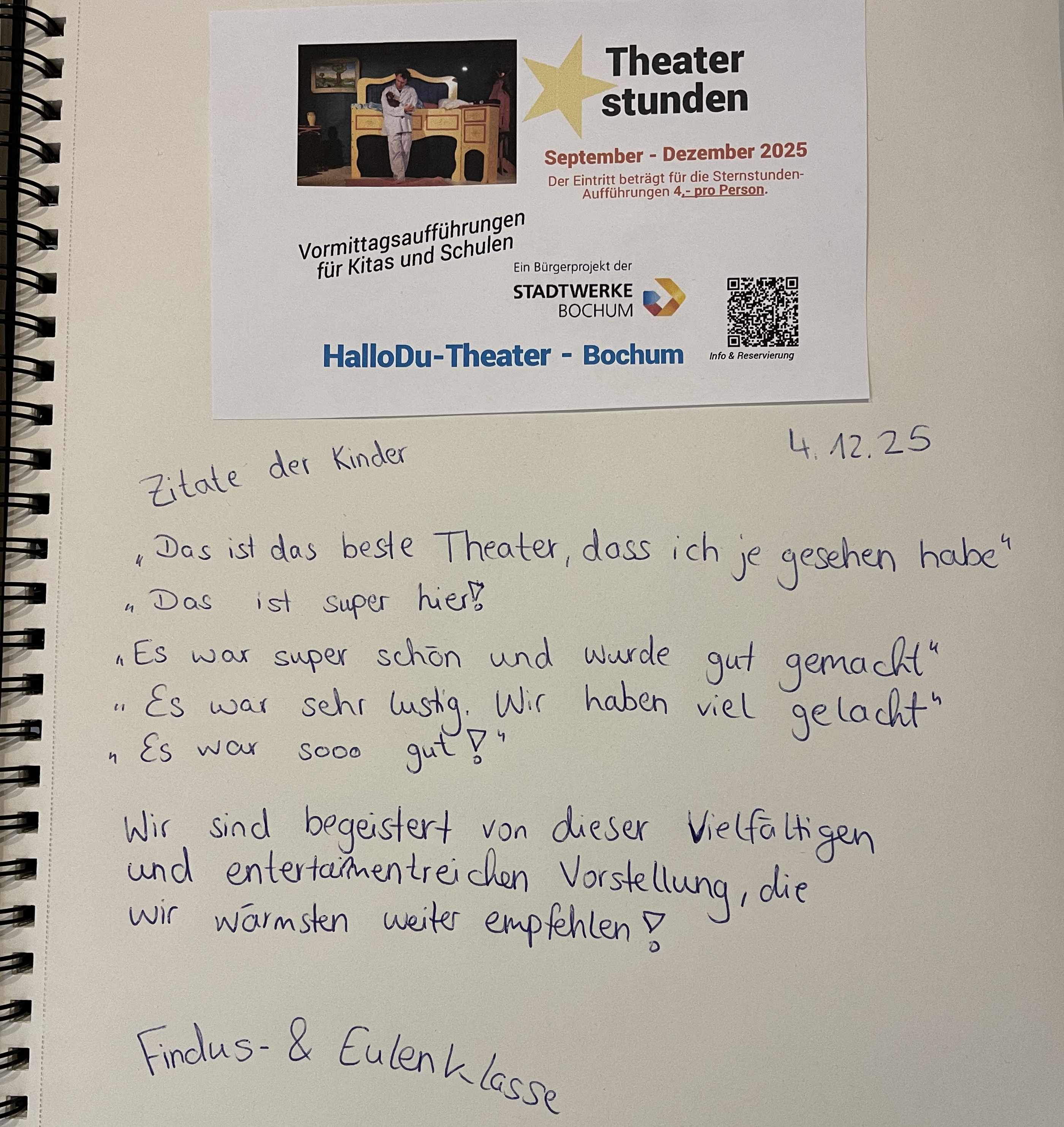 Für die TalentTage Ruhr wurden 2 Aufführungen des HalloDu-Theaters (24.9. + 02.10.) ausgewählt. Die TalentTage Ruhr vereinen jedes Jahr verschiedene Bildungsangebote aus dem Ruhrgebiet und vernetzen sie mit passenden Teilnehmenden. Die Veranstaltungsreihe fördert Talente unabhängig von ihrer Herkunft und trägt dazu bei, das Fachkräfteangebot für die Region langfristig zu sichern. Bei den Veranstaltungen können Kinder und Jugendliche ihre Stärken entdecken, berufliche Perspektiven erleben und sich persönlich ausprobieren. Die Angebote richten sich an Talente im Kindergarten- bis zum Hochschulalter. Die TalentTage Ruhr sind das größte Projekt der TalentMetropole Ruhr.