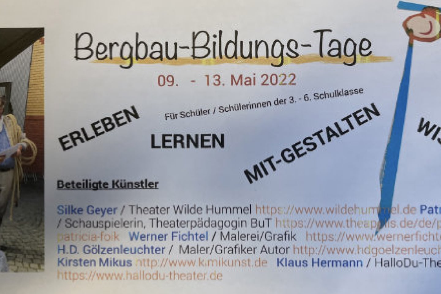 Die Bergbau-Bildungs-Tage verbinden ein Theatererlebnis mit Wissensvermittlung und der Erfahrung eigener Kreativität. Die Kinder und ihre begleitenden Lehrer*innen erfahren, wie die Steinkohle entstand, diese durch Jörgen, den Schweinehirten, entdeckt wurde und das Ruhrgebiet aufblühte. Im Spiel wird auch vermittelt, was der Bergmann benötigt, um seine gefährliche Arbeit unter Tage zu verrichten, wie die Kohle aus der Tiefe gefördert wird und das große Kapitel „Bergbau im Ruhrgebiet“ zu Ende geht. Dozenten, die in unterschiedlichen künstlerischen Bereichen tätig sind, arbeiten anschließend mit den Kindern in 90 minütigen Workshops. Beginnend mit dem Theaterstück „Glück Auf! Von ObenDrüber und UntenDrunter“ wird die Basis der Motive für die Workshops gelegt.